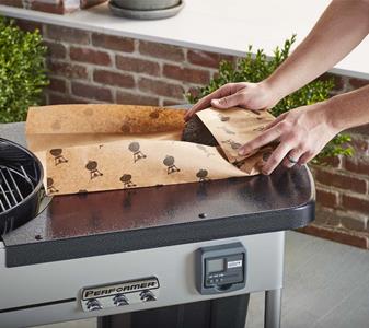 Serviere saftiges, aromatisches Fleisch mit perfekter Kruste, indem du es in Weber Butcher Paper einwickelst. Wenn du dein Fleisch in der Endphase eines langsamen Grillvorgangs bei niedriger Hitze in das Butcher Paper einwickelst, bewahrst du die Feuchtigkeit. Das Weber Butcher Paper ist mit Weber Kettle Logos bedruckt.