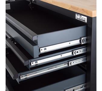 - die Laufschienen sind mit leicht laufenden, doppelt kugelgelagerten Schwerlastauszügen versehen