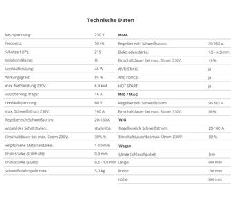 | Leerlaufspannung | 60 V | max. Schweißstrom 240 V | 160 A |